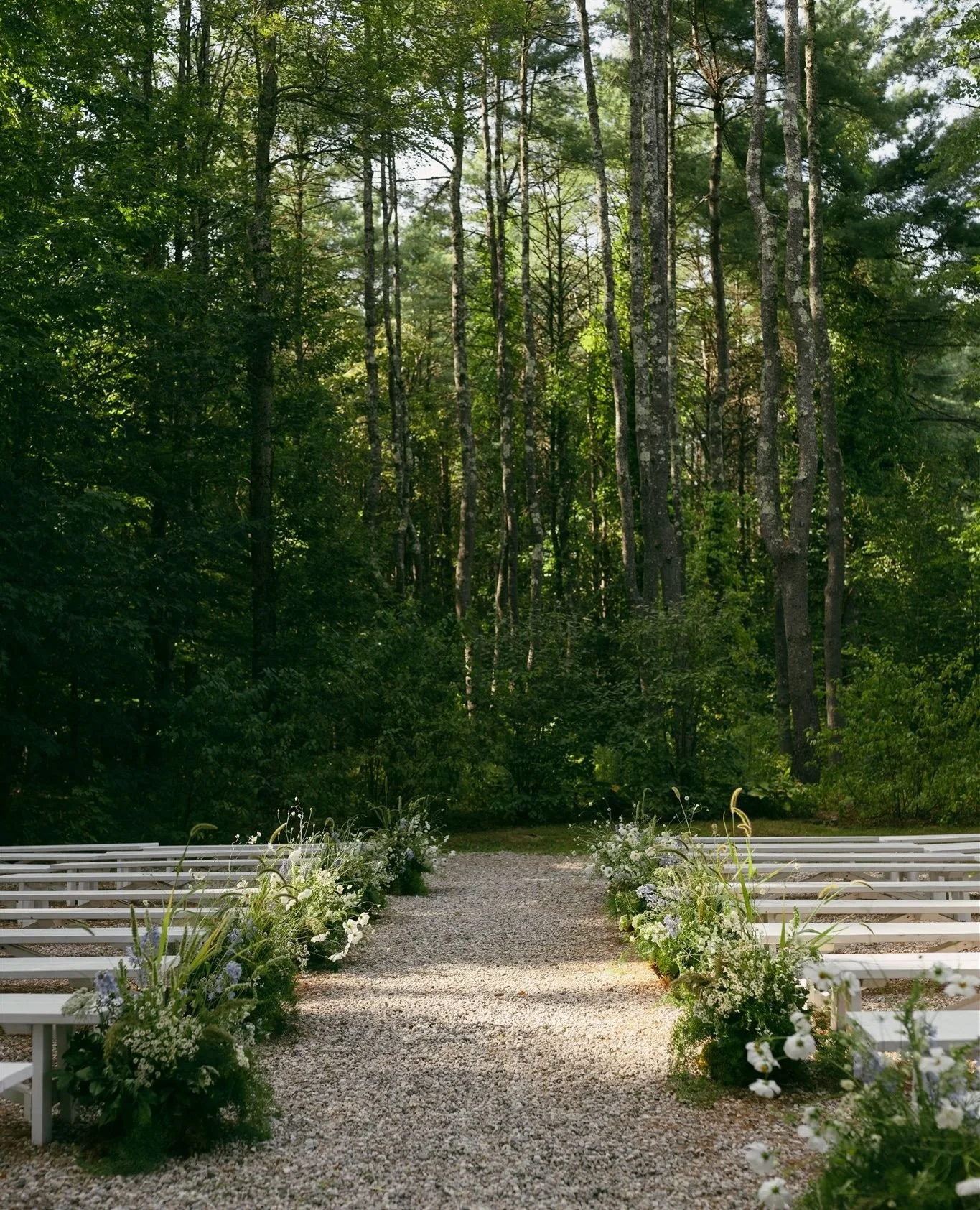 Spread across sixty-six acres, the property moves from open pasture to woodland sanctuary to orchard and patio. The six-acre rolling wildflower pasture accommodates tents, lawn games, and open-air gatherings, bordered by apple, birch, and evergreen trees. Two custom-designed boardwalks wind through the woodland toward a ceremony space nestled among the pines. A bluestone patio and outdoor fire pit anchor the outdoor gathering spaces for lobster bakes, cocktail hours, or evenings around the fire.