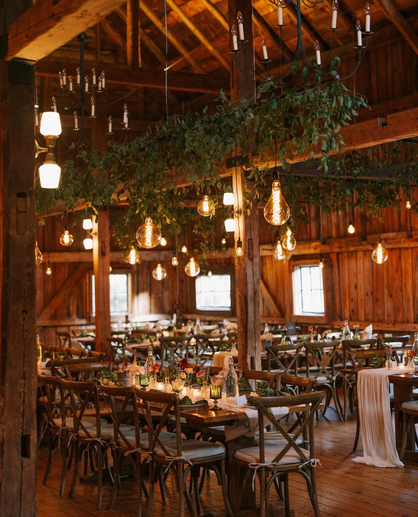 With its two-and-a-half-story vaulted ceiling and 1,800 square feet of entertaining space, Walnut Hill’s barn accommodates up to 200 guests, depending on layout and event flow. Topped by its historic rooftop cupola, the post-and-beam structure is softly illuminated by hand-wrought chandeliers and sconces, lending the space a warmth that feels distinctly New England.